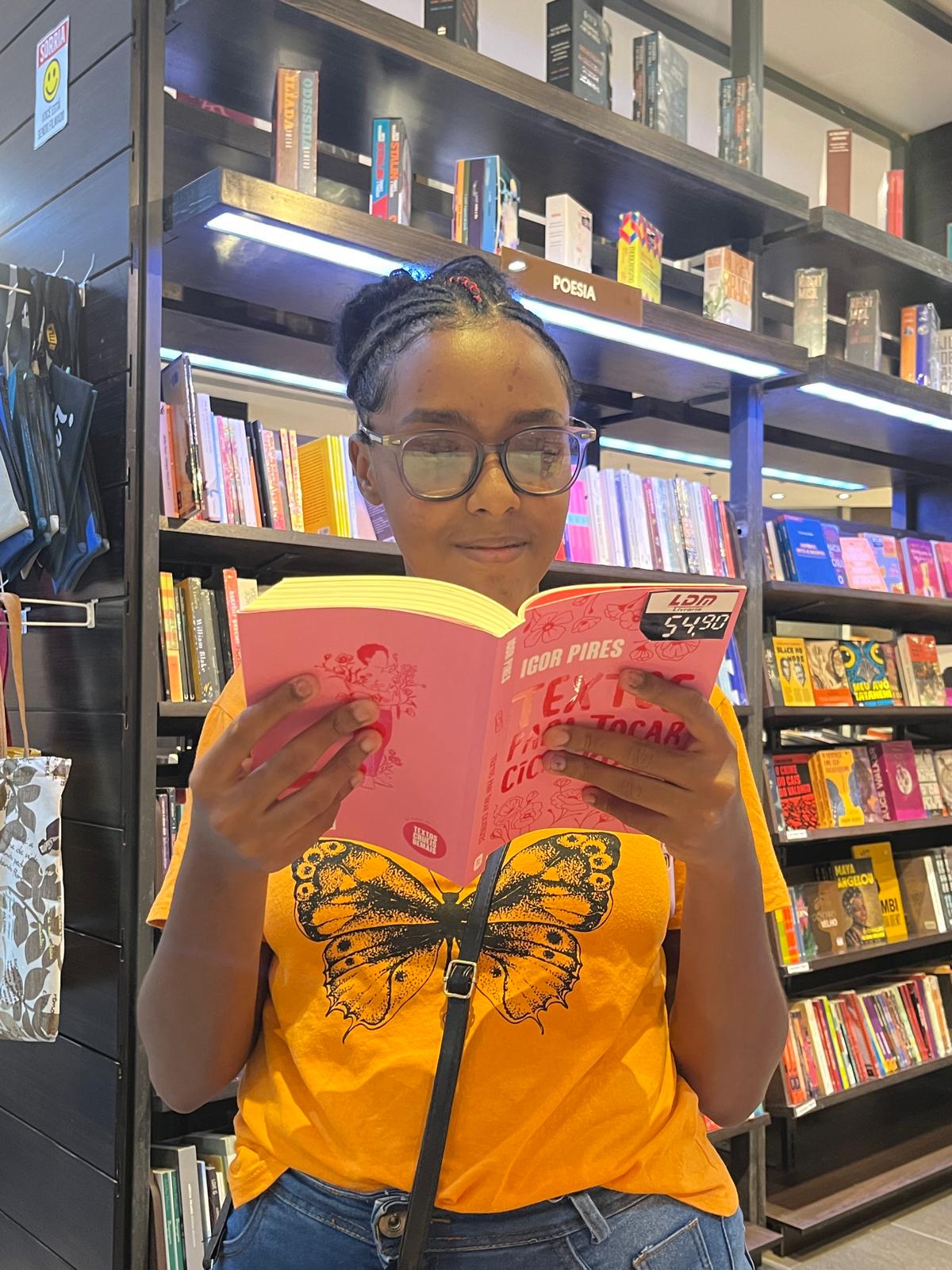 “Eu acho muito importante para nosso conhecimento vir a livrarias. Ler livros abre muitos caminhos, traz conhecimentos e é importante para nós, ainda mais que estamos no Ensino Médio e em preparação para o Enem (Exame Nacional do Ensino Médio) e a gente adquire vocabulário e isso nos ajuda. Eu escolhi um livro devocional "O Deus que destrói sonhos", do escritor Rodrigo Bibo, e estou muito ansiosa para ler ele, pois muitas pessoas leram e falam dele e eu quero ler.