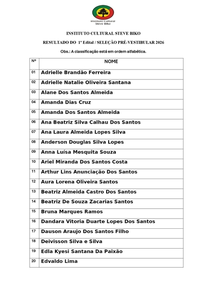O Instituto Steve Biko divulga a lista de aprovados no Pré Vestibular 2026 – Turma Milton Santos. Foram 71 aprovados após processo seletivo com mais de 130 jovens negros inscritos. Os estudantes frequentarão a formação em formato híbrido, com aulas presenciais no turno noturno, de segunda a sexta-feira, das 18h30 às 21h30, e aos sábados, das 13h15 às 17h40. A Aula Inaugural será neste sábado (21/3), no Espaço Dois de Julho, no IFBA (Canela), a partir das 14h. A aula é aberta ao público.
