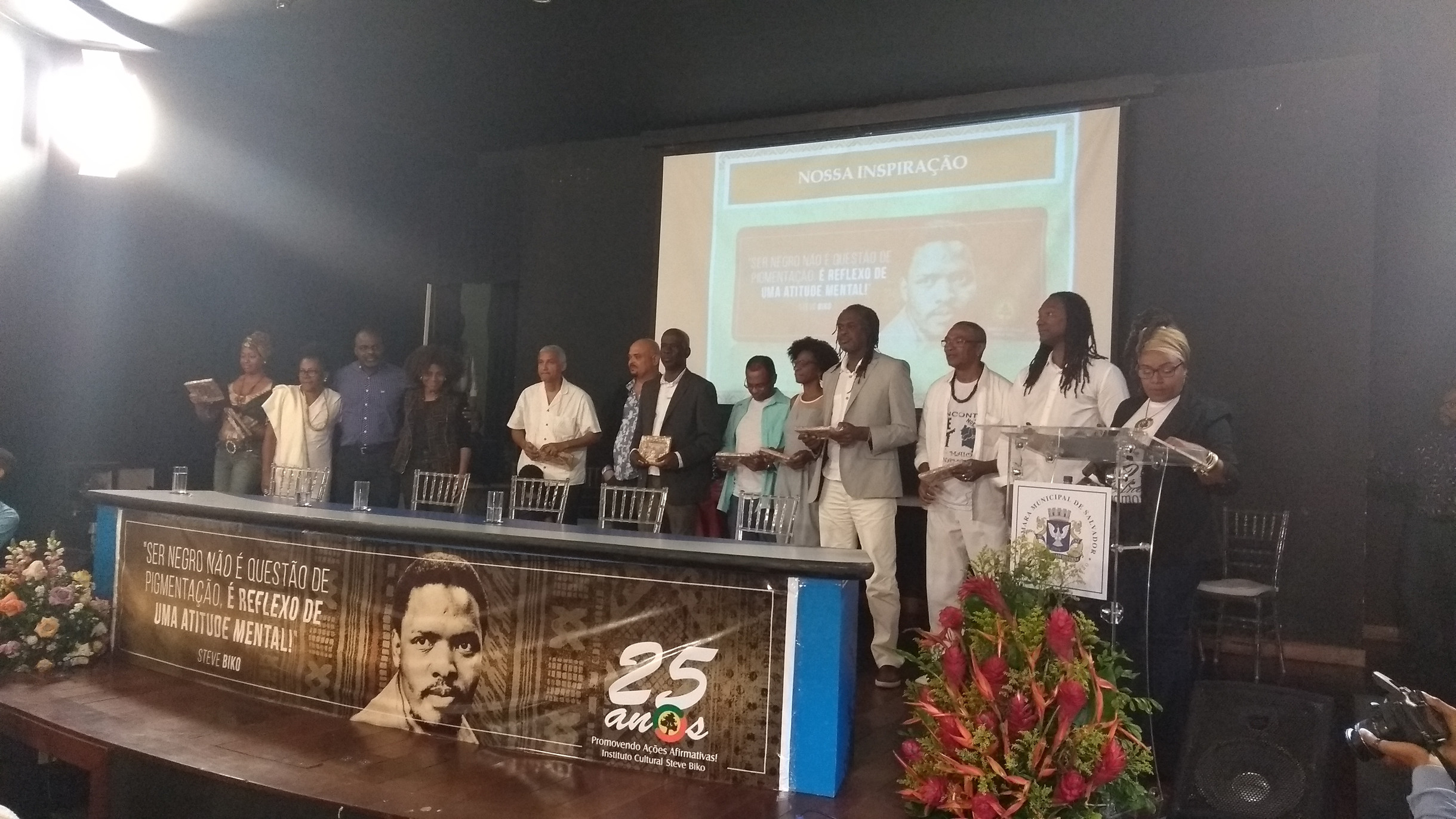 Na noite desta segunda-feira (31), o Instituto Steve Biko recebeu as palmas de mais de 200 pessoas, que lotaram o Centro Cultural da Câmara de Vereadores para celebrar os 25 anos do Instituto. Dentre alun@s, ex-alun@s, professor@s, fundador@s, diretor@s, amig@s e militantes – tod@s com uma só certeza: Biko Vive! E ele viveu nas falas da sociológa e Ouvidora da Defensoria Pública do Estado, Vilma Reis, na ancestralidade e sabedoria de Makota Valdina e na luta e trajetória da educadora, Sueli Santana – convidadas especiais da noite.